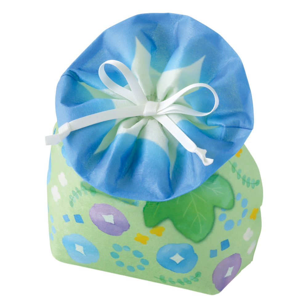 巾着上部の大きく咲いた朝顔が印象的なラッピング。本体部分の淡い朝顔柄も涼し気に、夏のアイコンとして店頭を夏らしく彩ります。