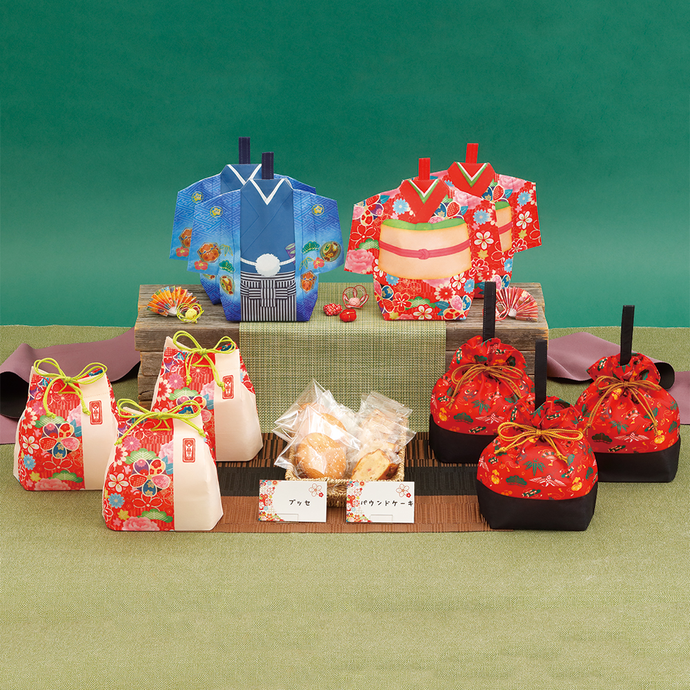 華やかな着物型のかわいいお正月ラッピング。七五三などのお祝い事や、インバウンドなどにもおすすめ。